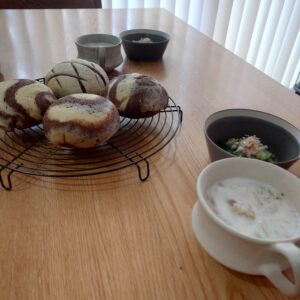 1月レッスン始まりました 2026年、新しい一年が始まりました 本年もどうぞよろしくお願いいたします!^^ 新年のスタート初日は安定のいつものメンバーが集まってくださりました 1月~2月は「ココアマーブルのメロンパン」です クッキー生地がポイントのこのパンは作るのがちょっと大変ですが、いざ作り出すと意外と楽しくて、出来上がりもワクワクさせてくれる特別感がメロンパンにはあると感じます^^ あまりフワフワし過ぎずに、しっとり柔らかく、甘すぎない仕上がりなので、見た目も味も大人の方にも喜んでもらえると思います レッスンでは、プレーンなメロンパンを作る時のために、ひとつだけ筋を入れて作っています レッスンで試したい方は遠慮なくチャレンジしてくださいね^^ 撮影のご協力ありがとうございました! スープにチーズ入れ忘れて本当にすみません>< 一日があっという間に終わって、一か月もあれよあれよと過ぎ、気が付けば一年またひとつ歳をとっている、そんな連続で過ごしている感覚ですが、それも平和あってのこと どうかこの一年も平和に健康にすごせればと願っています 2カ月に一度、この場所に集まって、わいわいと一緒にパンを作ってくださること、私にはとても大切な生きがいで、皆様のおかげで毎回とても楽しく過ごさせていただけて、本当に感謝しています これからも変わらず気兼ねなく、楽しい時間を一緒に過ごしていただけますように^^ まだまだ寒い日が続きますが、風邪に気を付けて暖かくしてお過ごしくださいね またここでお会いできるのを楽しみにお待ちしております^^